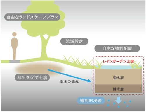 GX戦略では環境課題の解決に向け、「事業活動からのCO2排出ゼロ」「脱炭素に貢献する事業の推進」「新たな環境価値の創出」を3つの柱として定めています。 菅原氏は「 GX戦略では“脱炭素”と“自然共生”“資源循環”の3つの分野を包括的に扱いたいと考えていますが、それぞれの段階には差があります」と指摘します。「『事業活動からのCO2排出ゼロ』は必須の取り組みで作業所、事業所ごとに目標を設定して削減を進めています。“自然共生”と“資源循環”については、今まで行ってきた取り組みを改めて評価し、多面的に環境負荷低減につながる『脱炭素に貢献する事業の推進や新たな環境価値の創出の一部』として位置づけています」と続けます。 “自然共生”を進めるうえでの取り組みの一つがグリーンインフラです。「言葉の通り、自然の多様な機能を活用して自分たちの生活に反映していくという意味があります。最近の取り組みでは高浸透性の外構緑地であるレインテックガーデン®があげられます。緑地に降った雨水の『浸透』と『保水』を両立し、敷地外への雨水の流出を抑制します。使用する緑化資材にはリサイクル材を利用するなど、資源循環の取り組みともなっています。フジタのオリジナル技術としてお客様にも採用いただいております」(菅原氏)