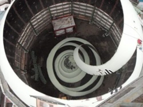 ガスタンクや石油タンク等の球形貯槽の解体を行う場合、従来の工法では仮足場を組み、切り出した外装鋼板を、クレーンで一つひとつ降ろしていました。りんご皮むき工法では、構造物を外側から順に削ぎ落とすことで、外装鋼板は重力によって渦巻き状に下へと降りていきます。仮足場や燃料を使うクレーンが不要になることで、解体費用の軽減や工期短縮だけでなく、CO2排出量の削減にもつながっています。