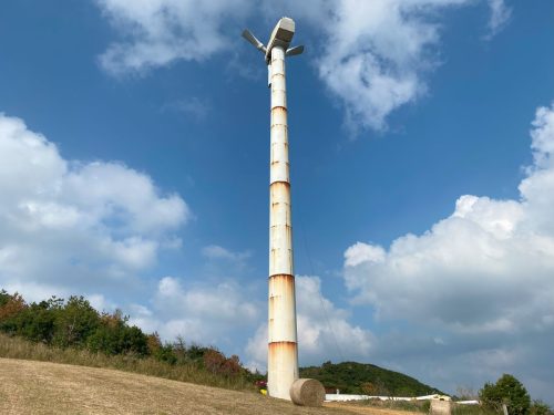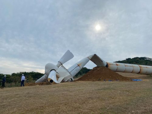 「転倒工法」は、垂直構造物の解体において、同じく重力を活用するという発想に基づき、転倒軸を計算し、構造物を狙った方向に正確に倒すことで、エネルギーの削減と工期短縮を実現する特許工法です。当時の社員(現・専務取締役の長泰治氏)の発案によって開発されました。この工法は、風⼒発電設備の解体などに用いられています。ブレードを撤去したタワーの根元を切断し、本体を狙った場所に正確に転倒させることで、従来の工法で必要だった足場組みとクレーンの使用を省略することができます。