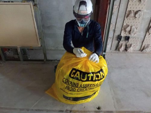 カーボンニュートラルへの取り組みとして、次に注目したのが、解体工事の際に使用されるアスベスト廃棄袋と養生シートでした。解体現場で排出されるアスベストは法令に従った指定の袋に入れて厳しい基準の下、そのほとんどが埋め立て処分されています。さらに解体時のアスベスト含有調査の結果、石綿除去工事が増加すれば、それに伴い工事区画を密閉するための養生シートの使用量も増加します。「当社が解体するプラント建造物は、数十年以上前に設置された設備が多く、有害物質であるダイオキシン、PCB、鉛含有塗膜などの除去も頻繁に行っています。こうした環境工事においても、大気汚染防止法に基づいた密閉養生を行う際には、主にビニール製の養生シートが使用されますが、有害物質が付着するため、使用後はリサイクル原料として利用することができず、廃棄処分されるのが現状です」(瀬古氏)