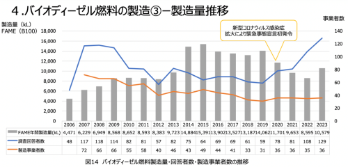 バイオディーゼル燃料製造量・回答者数・製造事業者数の推移