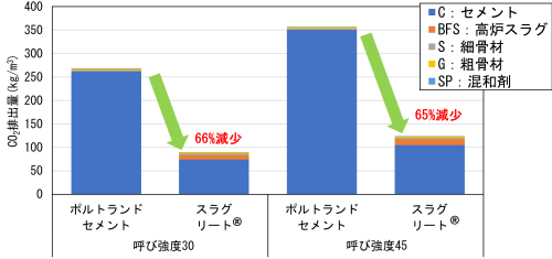 次に、コンクリート製造にはセメントをかなり消費しますが、このセメント製造時にもたくさんのCO2が発生しています。ここをいかに低炭素の材料に変えていくかという課題があります。西松建設と当社で共同開発した「スラグリート®」は、製鉄所の高炉から発生する副産物である高炉スラグの微粉末を、セメントの代替として用いることで、セメント製造における温室効果ガスの排出量を削減したコンクリートです。コンクリートの材料起源のCO2排出量を60~70%削減できます。