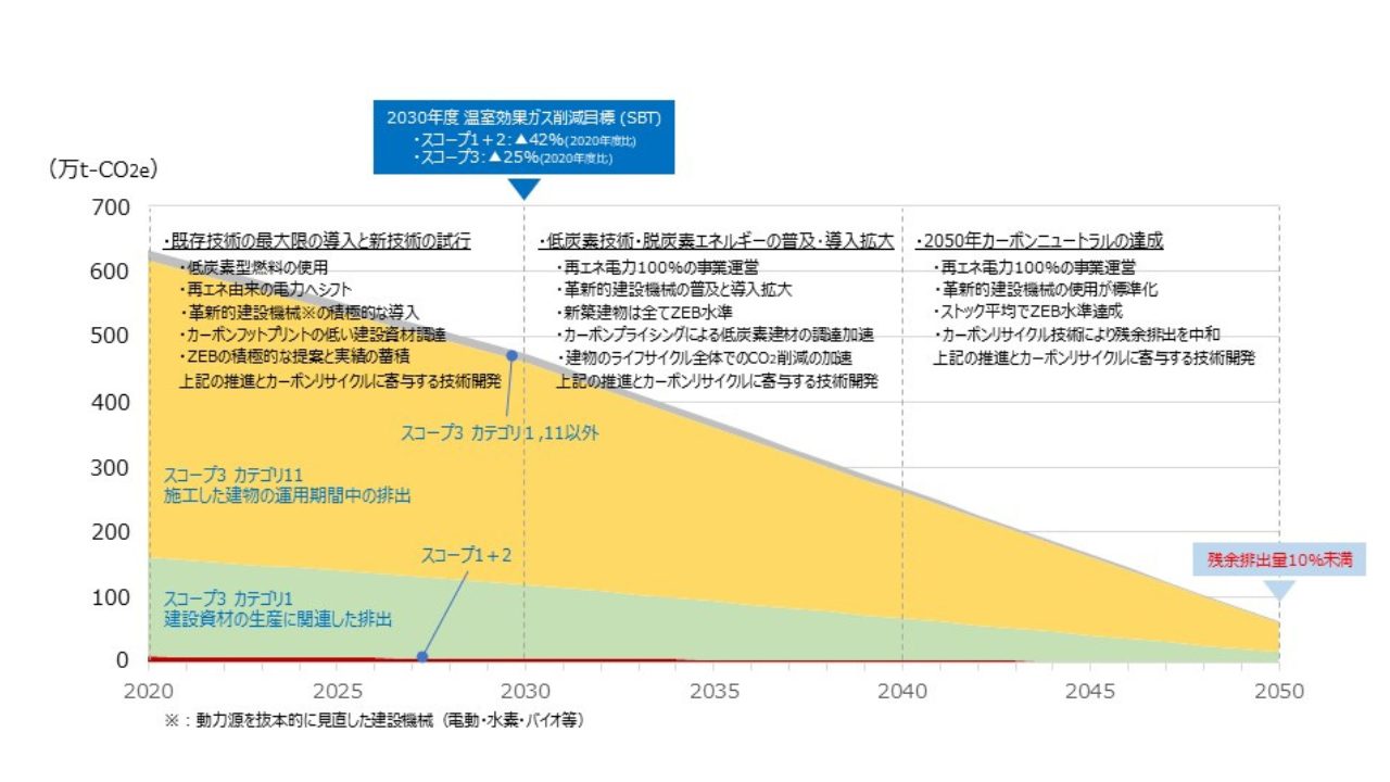 例えば、現場で使う重機は軽油で動いていますが、これを電動化するにはメーカーさんへの働きかけが必要ですし、建物が排出するCO2削減のためには、我々が発注者に対しエネルギー消費の少ない建物を提案していくことが大事だと思います。