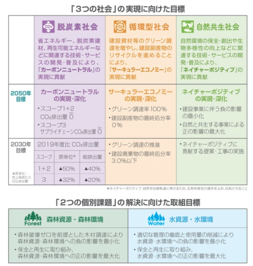 大成建設グループは「人がいきいきとする環境を創造する」という理念のもと、以下3つの社会の実現と2つの個別課題の解決に向けた取組目標を掲げています。脱炭素社会については、2050年までに自社の事業活動ならびにサプライチェーン全体を含めたCO2排出量をゼロにすることを目指しています。