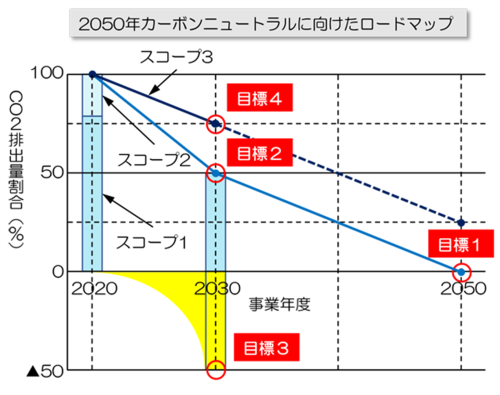 原氏:「2050年カーボンニュートラルに向けたロードマップ」では、Scope1と2のCO2排出量を2030年までに50%削減することを目指します。加えて、再生可能エネルギー事業等への取り組みによって、2030年までに実質的にカーボンニュートラルの達成を目指します。