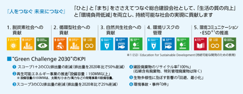 「Green Challenge 2030」には、「脱炭素社会への貢献」「循環型社会への貢献」「自然共生社会への貢献」「環境リスクの管理」「環境コミュニケーション・ESDの推進」の5つの柱があり、その中でも当社が一番注力しているのが「脱炭素社会への貢献」です。