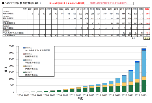 CASBEE認証物件数は増加しており、特に2021年以降の増加が著しい。