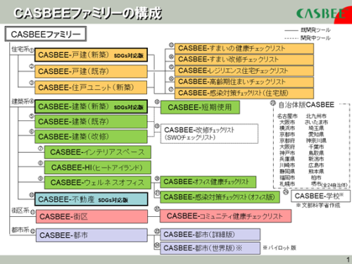 CASBEEには、建物などを評価する建築系(住宅建築、一般建築)だけでなく、都市・まちづくり系(都市、まちづくり)や住宅系などさまざまな評価ツールがあり、全体を総称して「CASBEEファミリー」と呼ばれています。