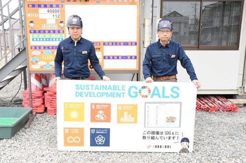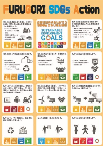 2022年には、取り組み目標を11項目にまとめた「FURUGORI SDGs Action」を公表し、ポスターや横断幕にして各部署に掲げています。その中では、2050年にCO2実質排出量ゼロを目指すことを示し、具体策として、ハイブリッド重機の使用やアイドリングストップの推進、植樹などの施策を挙げています。