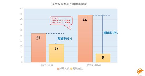 リクルート活動の変化は離職率の低下にもつながっています。「会社の情報を学生にきちんと発信しないまま採用すると、入社後にギャップが生じて辞めてしまう。ブランディングを始めて会社の中身をフルオープンで見せることによって、ギャップを感じて辞める人が少なくなりました」(渡辺氏)