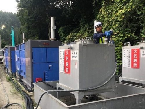 大石トンネルは、2021年5月に発生した地震による地すべりで一部区間通行止めが続く西和賀町大石地区の国道107号に新たに作るトンネルで、2022年10月に着工、2025年末の開通を目指しています。発電機3台と協力会社持ち込みの建機10数台を使用しており、燃料油を安藤ハザマが支給する形で、従来の軽油からB5へと切り替えました。7月からは全量をB5とし、使用量は1日あたり約3,000lとなっています。