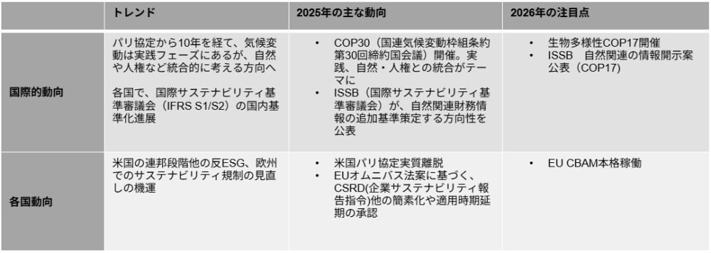 以上が、2026年の注目点です。2025年はパリ協定から10年目の年でしたが、目標だけでなく実践が重要であると改めて強調されることが多かったようです。実際に、案件への入札、資金調達、採用など様々な分野で自社の気候変動対応が話題になるケースが増加していると思います。これからは実務でどこまでできているかがますます重要になると思います。