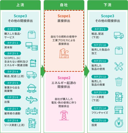 現在、温室効果ガスの排出削減は自社のみではなく、自社の上流と下流を含むサプライチェーン全体で削減しようと言う取り組みがなされています。このサプライチェーン排出の枠組みはGHGプロトコルにより定められており、排出源に応じてScope1、Scope2、Scope3に分かれています。