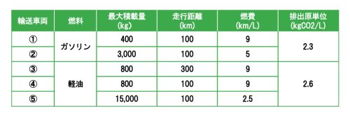 以下に、ある工事現場で使用された輸送車両の積載量と使用燃料を表にまとめました。実際の燃費が分かっている場合はその値を用いた方がより正確な計算ができますが、今回は計算しやすいように切りのいい数字を使用いたしました。