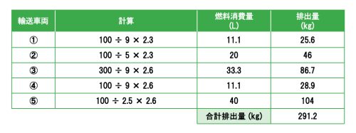 先ほどの表で輸送車両ごとにCO2排出量を計算した結果を以下の表にまとめます。